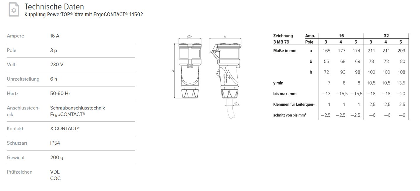 Розетка 16А 3P 6H 230V IP54 кабельний конектор з'єднувач для авто-кемпінгів (Alt Аrт. #180AC IP44) PowerTOP Xtra Neue Typen Mennekes 14502!