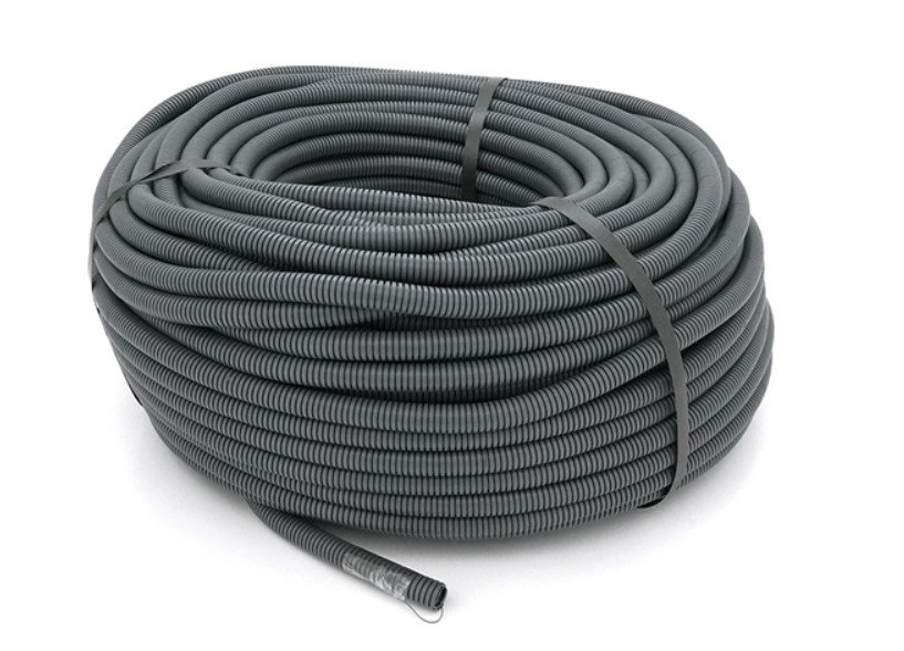Миним. кол-во для заказа "Труба гибкая гофрированная ПВХ 25/19мм с протяжкой серая 350Н бухта 100 м UEA METAKSAN" = 100.