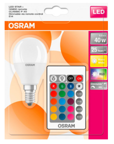 Мінімальна кіль-ть для замовлення "Світлодіодна лампа LED CL P40 REM 5,5W/827 230V FR E14 OSRAM пульт в комплекте" = 4.