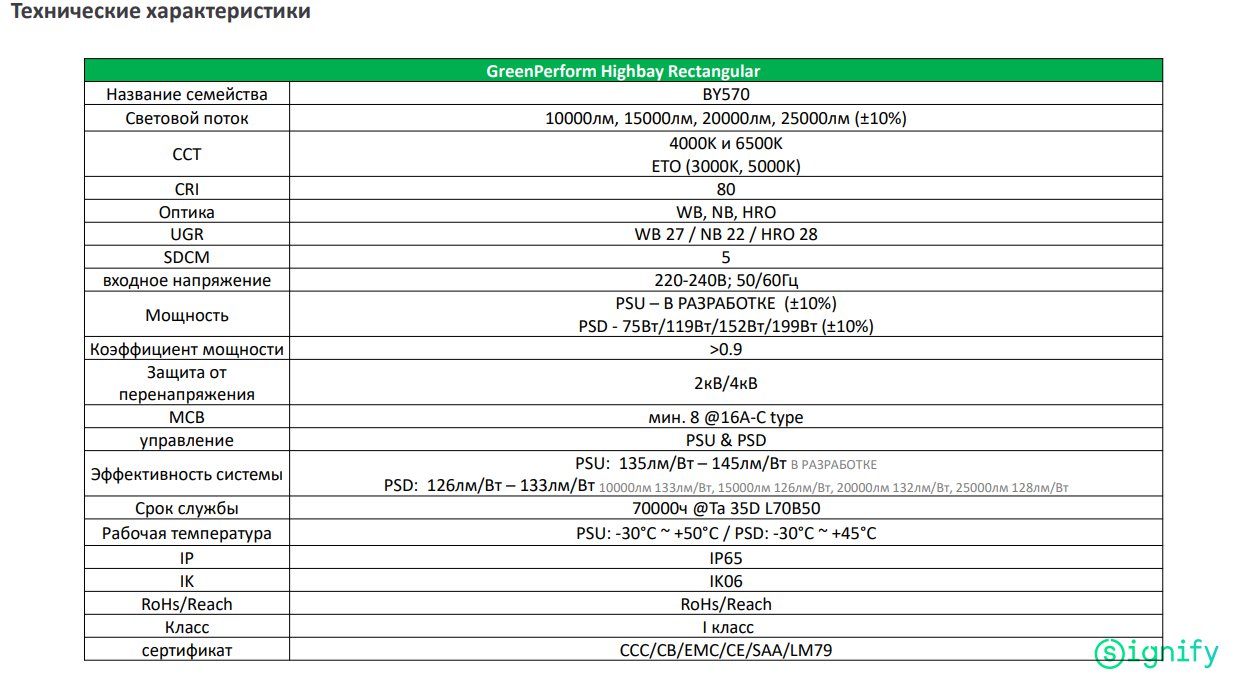 GreenPerform Highbay Rectangular Назва сімейства BY570 Світловий потік 10000лм, 15000лм, 20000лм, 25000лм (± 10%) CCT 4000K і 6500K ETO (3000K, 5000K) CRI 80 Оптика WB, NB, HRO UGR WB 27 / NB 22 / HRO 28 SDCM 5 вхідний напруга 220-240В; 50 / 60Гц Потужність PSU - У РОЗРОБКИ (± 10%) PSD - 75Вт / 119Вт / 152Вт / 199Вт (± 10%) Коефіцієнт потужності> 0.9 Захист від перенапруги 2кВ / 4кВ MCB хв. 8 @ 16A-C type управління PSU & PSD Ефективність системи PSU: 135лм / Вт - 145лм / Вт В РОЗРОБКИ PSD: 126лм / Вт - 133лм / Вт 10000лм 133лм / Вт, 15000лм 126лм / Вт, 20000лм 132лм / Вт, 25000лм 128лм / Вт Термін служби 70000ч @Ta 35D L70B50 Робоча температура PSU: -30 ° C ~ +50 ° C / PSD: -30 ° C ~ + 45 ° C IP IP65 IK IK06 RoHs / Reach RoHs / Reach клас I клас сертифікат CCC / CB / EMC / CE / SAA / LM79