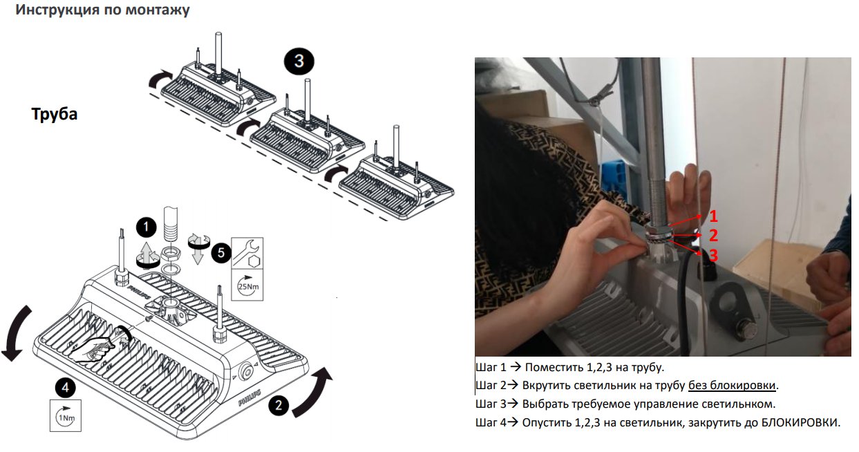 Шаг 1 → Поместить 1,2,3 на трубу. Шаг 2→ Вкрутить светильник на трубу без блокировки. Шаг 3→ Выбрать требуемое управление светильнком. Шаг 4→ Опустить 1,2,3 на светильник, закрутить до БЛОКИРОВКИ.
