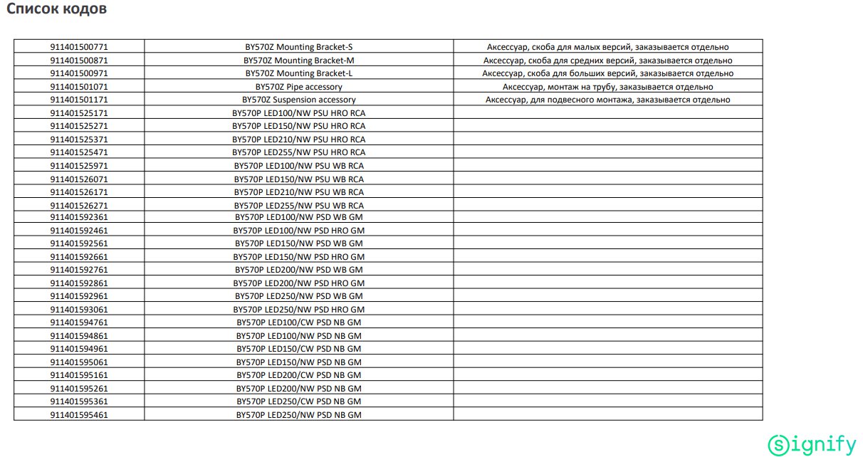 911401500771 BY570Z Mounting Bracket-S Аксесуар, скоба для малих версій, замовляється окремо 911401500871 BY570Z Mounting Bracket-M Аксесуар, скоба для середніх версій, замовляється окремо 911401500971 BY570Z Mounting Bracket-L Аксесуар, скоба для великих версій, замовляється окремо 911401501071 BY570Z Pipe accessory Аксесуар , монтаж на трубу, замовляється окремо 911401501171 BY570Z Suspension accessory Аксесуар, для підвісного монтажу, замовляється окремо 911401525171 BY570P LED100 / NW PSU HRO RCA 911401525271 BY570P LED150 / NW PSU HRO RCA 911401525371 BY570P LED210 / NW PSU HRO RCA 911401525471 BY570P LED255 / NW PSU HRO RCA 911401525971 BY570P LED100 / NW PSU WB RCA 911401526071 BY570P LED150 / NW PSU WB RCA 911401526171 BY570P LED210 / NW PSU WB RCA 911401526271 BY570P LED255 / NW PSU WB RCA 911401592361 BY570P LED100 / NW PSD WB GM 911401592461 BY570P LED100 / NW PSD HRO GM +911401592561 BY570P LED150 / NW PSD WB GM 911401592661 BY570P LED150 / NW PSD HRO GM 911401592761 BY570P LED200 / NW P SD WB GM 911401592861 BY570P LED200 / NW PSD HRO GM 911401592961 BY570P LED250 / NW PSD WB GM 911401593061 BY570P LED250 / NW PSD HRO GM 911401594761 BY570P LED100 / CW PSD NB GM 911401594861 BY570P LED100 / NW PSD NB GM 911401594961 BY570P LED150 / CW PSD NB GM 911401595061 BY570P LED150 / NW PSD NB GM 911401595161 BY570P LED200 / CW PSD NB GM 911401595261 BY570P LED200 / NW PSD NB GM 911401595361 BY570P LED250 / CW PSD NB GM 911401595461 BY570P LED250 / NW PSD NB GM