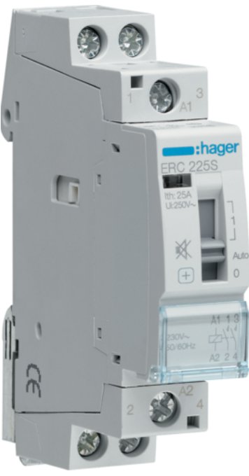 Контактор безшумний з ручним управлінням 25A 2 полюси 2НО [Uc] 230В [Ue] 230V AC 1-модульний Hager ERC225S