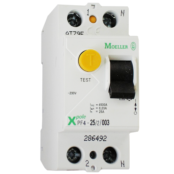 Двухполюсное реле дифференциального тока на ток утечки 30 мА Номинальное значение рабочего тока 25А. Требует установки автомата защиты.