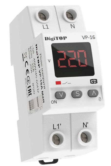 Реле напруги VP-16A M2R з термозахистом 16А min 120-200В, max 210-270В 2 модулі в компактному корпусі DigiTOP VP-16A M2R