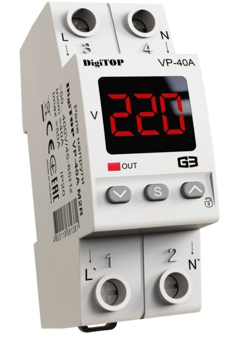 Реле напруги VP-40A M2R з термозахистом 40А min 120-200В, max 210-270В 2 модулі в компактному корпусі DigiTOP VP-40A M2R