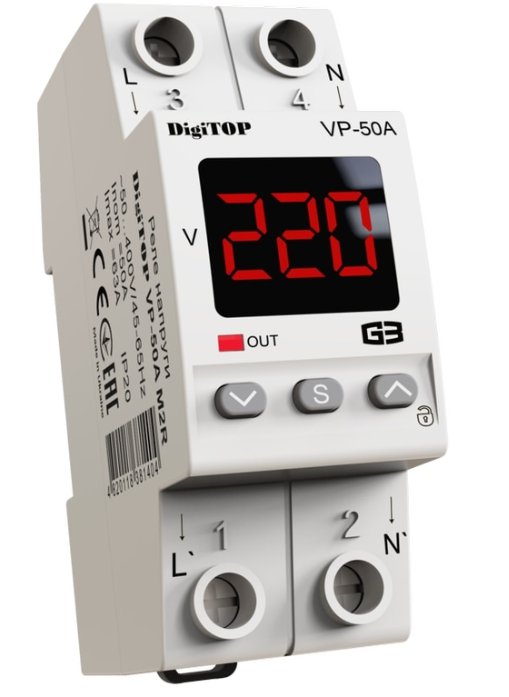 Реле напруги VP-50A M2R з термозахистом 50А min 120-200В, max 210-270В 2 модулі в компактному корпусі DigiTOP VP-50A M2R