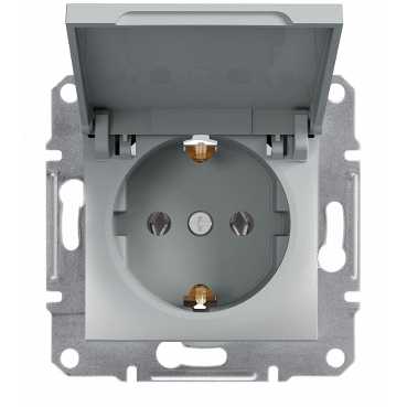Розетка з серії Asfora виготовлена з якісних матеріалів стійких до ультрафіолетового випромінювання. Виконана в кольорі - алюміній. Механізм може монтуватися як на шурупах так і з допомогою розпірних лапок. Ступінь пиловологозахисту IP 44. Застосовується, в основному, в приміщеннях де є ризик потрапляння крапель води або крупного сміття на контакти розетки. Прихований Монтаж.