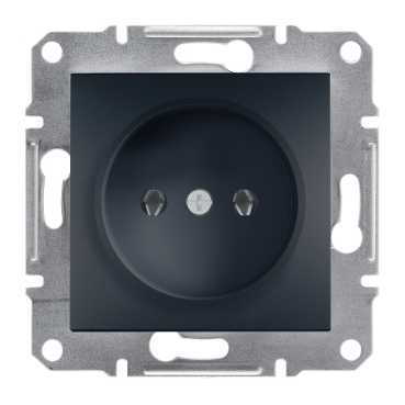 Побутова розетка серії Асфора кольору "Антрацит". Розрахована на 3,5 кВт комутованій потужності. Виготовляється з якісного АБС пластика, стійкого до подряпин. Глянсова поверхня покрита спеціальним шаром, що робить пластик розетки не восприимчевым до впливу ультрафіолету. Розетка оснащена гвинтовими клемными колодками "Lift terminals " що упрощет монтаж і робить використання доступним навіть без спеціальної освіти. Розетка без заземлення може легко використовуватися з рамками та інших кольорових гам. Прихований Монтаж.