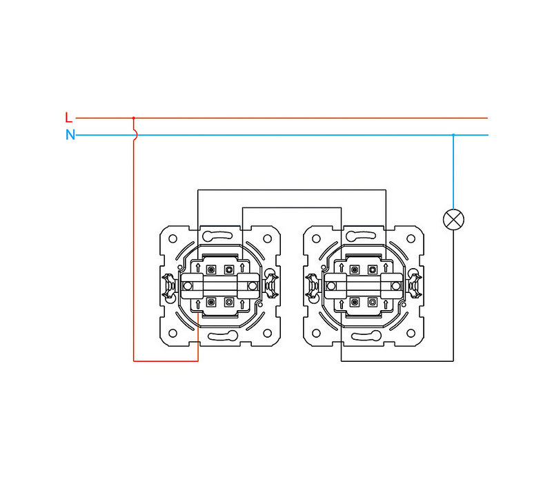 Прохідний вимикач одноклавішний на два напрямки, підходить для використання у великих приміщеннях. Завдяки своїй схемі з'єднання, дозволяє управляти навантаженням з декількох місць. Застосовується для установки в монтажні коробки в стіну. Може комбінуватися з декоративними рамками різних кольорів серії Asfora. Застосовується як вимикач в довгих коридорах. Використовується для комутації навантаження до 2,5 кВт. Матеріал не підтримує горіння АБС-пластик, стійкий до подряпин. Поверхня стійка до впливу ультрафіолету. Прихований Монтаж.