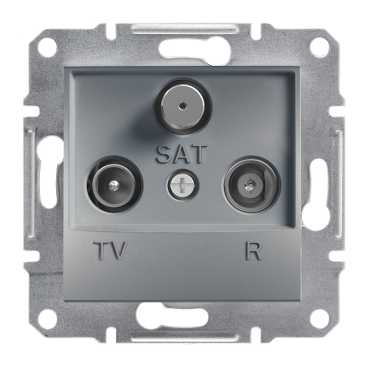 Телевізійна розетка TV-R-SAT для підключення сигналу від кабельної антени, радіо антени і сигналу сетелит. Відноситься до кінцевого типу підключення, застосовується в схемах з використанням прохідних розеток. При підключенні серії прохідних розеток - замикаючим елементом повинна бути кінцева розетка. Характеризується загасанням сигналу 1дБ. Матеріал не підтримує горіння АБС-пластик, стійкий до подряпин. Поверхня стійка до впливу ультрафіолету. Установка прихована, в монтажну коробку.
