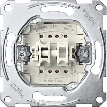 Механізм вимикача 2-клавішного, номінальний струм 10 А, напруга 250 Ст. Використовується система швидкого монтажу QuickFlex, що дозволяє економити до 25 % часу при установці. Можливість проводити зміни і діагностику не витягуючи механізм вимикача з монтажної коробки за рахунок розташованих спереду контрольних контактів, також встановлювати модулі підсвічування. Виконана з металу і пластику. Монтаж вбудований.