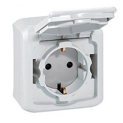 Розетка с заземляющим контактом. Дополнительно оснащена защитной крышкой что позволяет исползовать ее в местах где есть риск попадания механического мусора или брызг воды в розетку. Корпус изготовлен из АБС-пластика белого цвета. Устанавливается на поверхность стены. Правильное подключение обеспечивает возвожность использования активной нагрузки до 16А*250В.