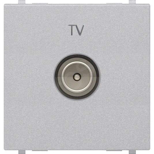 Двухмодульная простая телевизионная розетка, со штепсельным разъёмом врубного типа. Диапазон частот: 5 - 2400 МГц. Волновое сопротивление: 75 Ом. Затухание: 1 дБ Переходное затухание: не менее 16 дБ. Затухание отражения: не менее 7,6 дБ Тип разъёма: IEC 169-2, "папа". Материал - инновационный экологический композит цвета серебро высочайшего качества, что отмечено сертификатом AENOR Ecodiseño. Монтаж скрытый.