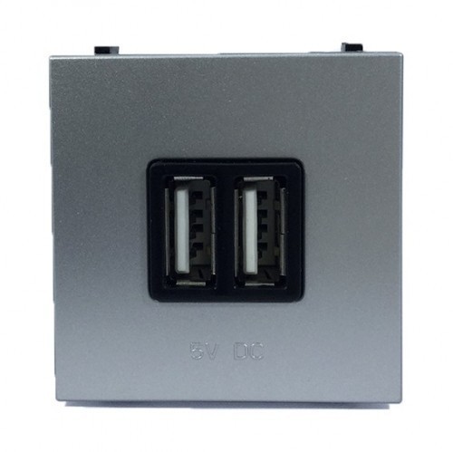 USB-зарядка двухмодульная цвета серебро серии Zenit. Номинальное напряжение на входе: 100 - 240 В~ ; ± 10 %. Номинальная частота на входе: 50 - 60 Гц. Потребление СН: менее 0,3 Вт. Напряжение на выходе: 5 В пост.тока ± 5 % Номинальный ток на выходе: 2 x 750 мА или 1 х 1500 мА, при 5 В пост. тока. Рабочая температура: 0º C до +45º C. Материал - инновационный экологический композит высочайшего качества, что отмечено сертификатом AENOR Ecodiseño. Монтаж скрытый.