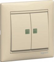 Бытовой электрический выключатель на две клавиши, применяется для паралельного управления двумя цепями нагрузки. Хорошо подходит для домашнего использования. Наличие подсветки помогает найти клавишу даже в условиях полной темноты, а светящийся огонек пожет узнать есть ли напряжение в сети. . Зеленая лампа подсветки 0,5 мА (7758 97) в комплекте. На корпусе изделия указан шаблон для зачистки кабеля. Механизм поставляется в комплекте с лицевой панелью - клавишей. Панель выполнена из высококачественного поликарбоната цвета слоновая кость, стойкого к механическим повреждениям и возгоранию. Суппорт, захваты, винты - оцинкованная сталь. Установка в монтажную коробку.