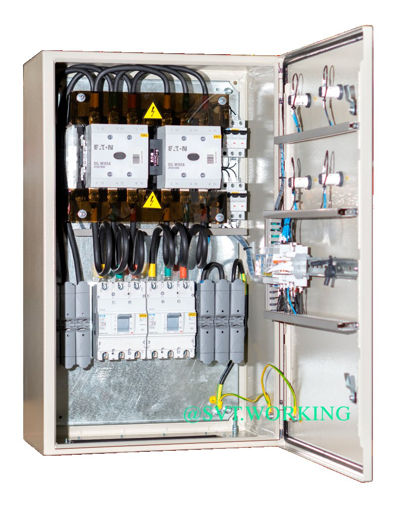 Щит АВР-200 обеспечивает автоматическое переключение между двумя источниками питания (2 ввода). Предусмотрены автоматические защитные выключатели на вводах; Предусмотрена механическая и электрическая блокировка от одновременного срабатывания контакторов; Предусмотрен механизм выдачи сигнала на запуск генератора при пропадании питания на основном сетевом вводе; Предусмотрена индикация режимов работы схемы на дверях щита. ВНИМАНИЕ! Комплектация, схемное решение и компоновка могут не соответствовать примеру приведенному на иллюстрации Товара и определяется на момент заказа.