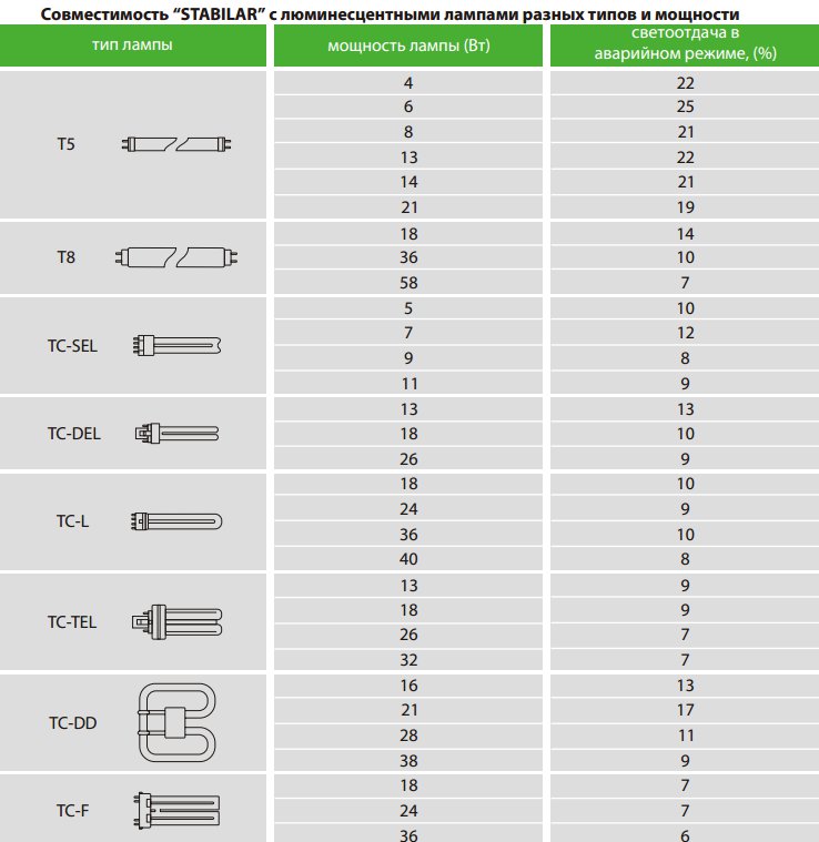 Один “STABILAR” предназначен для одной лампы, и может работать с линейными и компактными люминесцентными лампами разных типов. Элементы для сборки батареи тщательно отобраны на специальном стенде, сварены методом точечной сварки и упакованы в термопленку. В качестве элементов сборки используются только высокотемпературные NiCd аккумуляторные батареи. Для индикации процесса заряда батареи, “STABILAR” комплектуется светодиодом.
