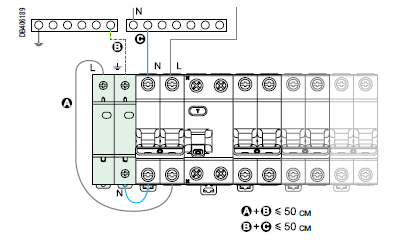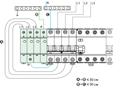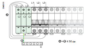 При подключении УЗИП, сумма длины провода к полюсу УЗИП-а и от УЗИП-а к заземлению не должна превышать 50 см.